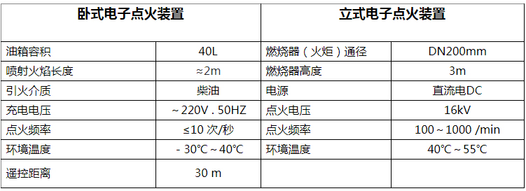 电子点火装置是环保型放喷火炬,适用于各种人为所不能及的远距离以及空中和有毒气体的燃烧场所点火,特别适用于采油(气)站集输管线内气体或石油、天然气、钻井作业处理溢流,以及压井作业时经液气分离器分离出来的天然气实施远距离点火,排除了人工点火的不安全因素。避免天然气与空气混合时可能产的爆炸和含有 H2S 的气体对人体和设备的伤害。